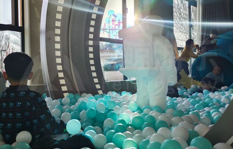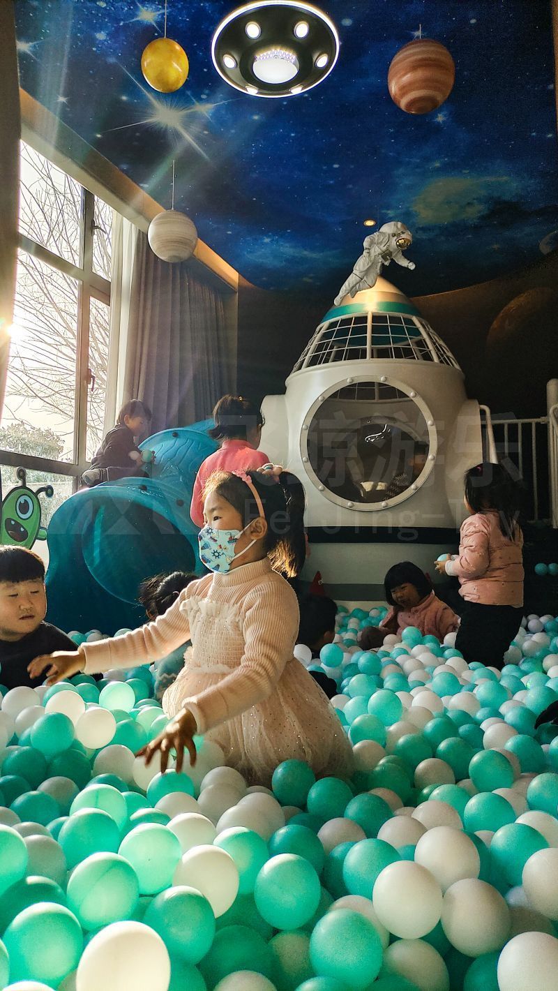 航天主题游乐设备搭配海洋球,如置身蓝色天穹。微光散落,快乐气息感染每一个人。