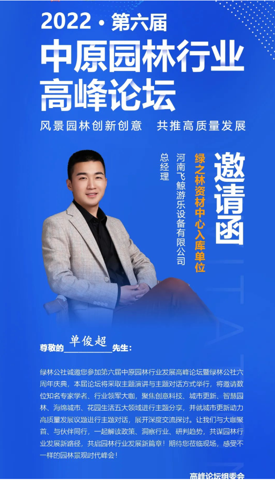很荣幸我司作为受邀方参加第六届中原园林行业发展高峰论坛暨绿林公社六周年庆典,河南飞鲸游乐设备有限公司是一家集创新研发、规划设计、生产、销售、售后服务为一体的综合型儿童甘肃无动力游乐设备供应商,生产基地位于国内最大的游乐设备基地浙江温州桥下镇,飞鲸与众多设计院、专业设计人才、创新型材料厂商携手,提供最具创意和安全的儿童活动空间以及产品整体解决方案。
